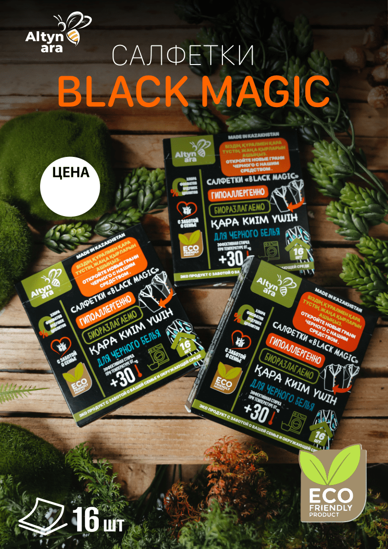 BLACK MAGIC — это мощные салфетки для стирки чёрного и тёмного белья, которые сохраняют глубину цвета и предотвращают выцветание. Добавьте одну салфетку в барабан — она впитает лишние красители и грязь, защищая чёрные вещи от серости и потери насыщенности.