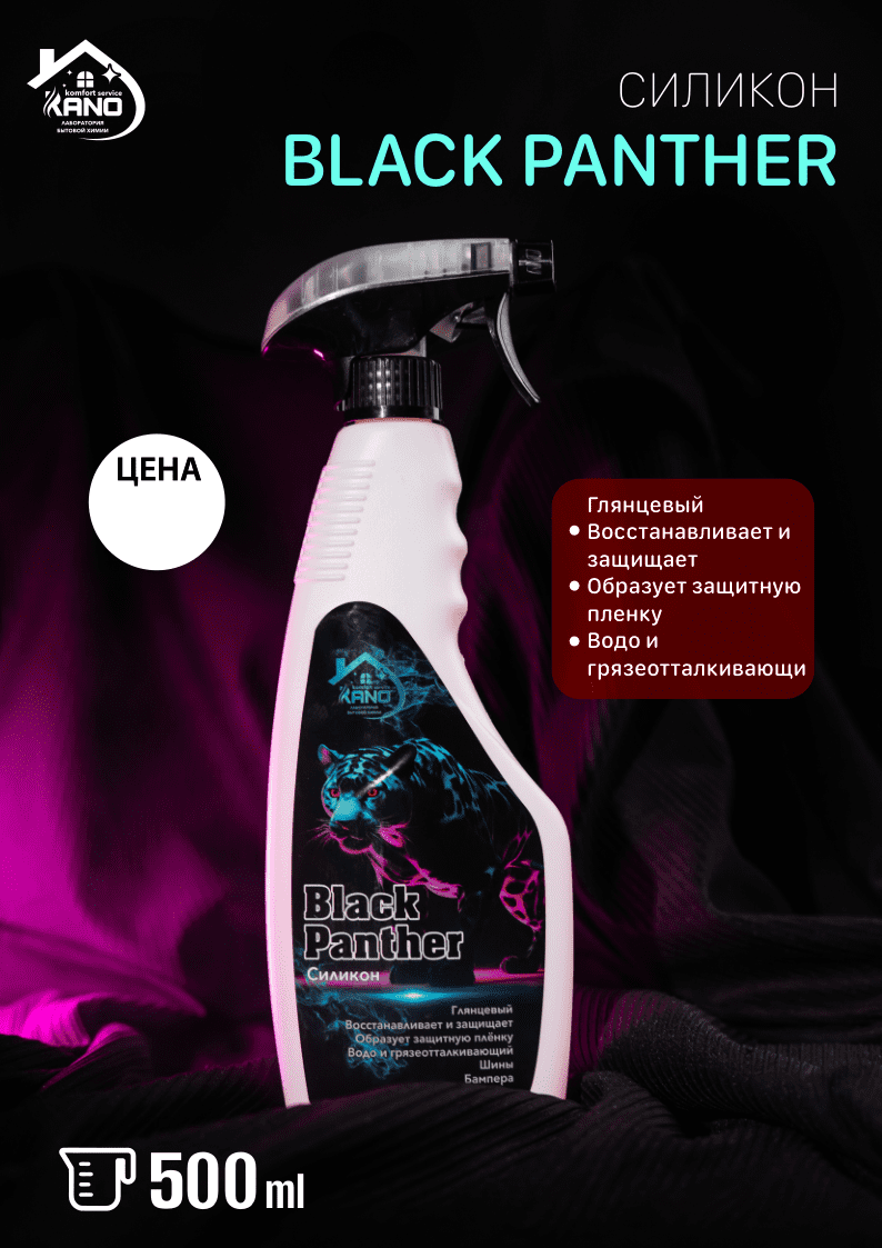 Black Panther — глянцевый силиконовый спрей-полироль для ухода и защиты автомобильных поверхностей. По фото видно, что формула ориентирована на восстановление внешнего вида и защиту резиновых и пластиковых элементов — даёт насыщенный блеск и отталкивающий эффект против воды и грязи.